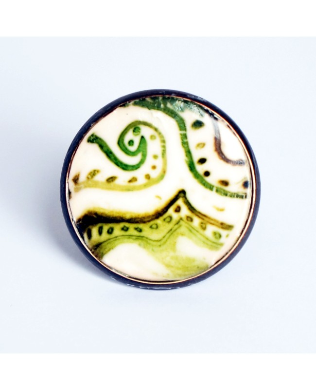 Cette bague, réalisée sur un support ajustable de couleur bronze, est une création unique. En effet, le cabochon blanc et vert a été réalisé en pâte polymère et encres en un unique exemplaire. Cette bague a ainsi un aspect ancien et rétro que vous ne trouverez nulle part ailleurs. Son diamètre est de 28 mm.