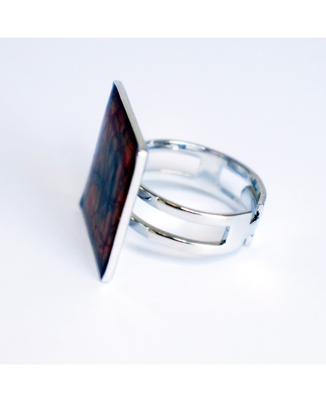 Cette bague fantaisie grise et orange a été réalisée à partir de peinture nacrée dont la caractéristique est de former des écailles ou prismes de manière aléatoire. Chaque modèle est ainsi unique et incomparable. Afin de protéger la peinture et apporter de la brillance à ce bijou, une fine couche de résine a été ajoutée par dessus la peinture. Le support est quant à lui ajustable et argenté. Vous pourrez donc changer votre bague de main et de doigt au gré de vos envies.