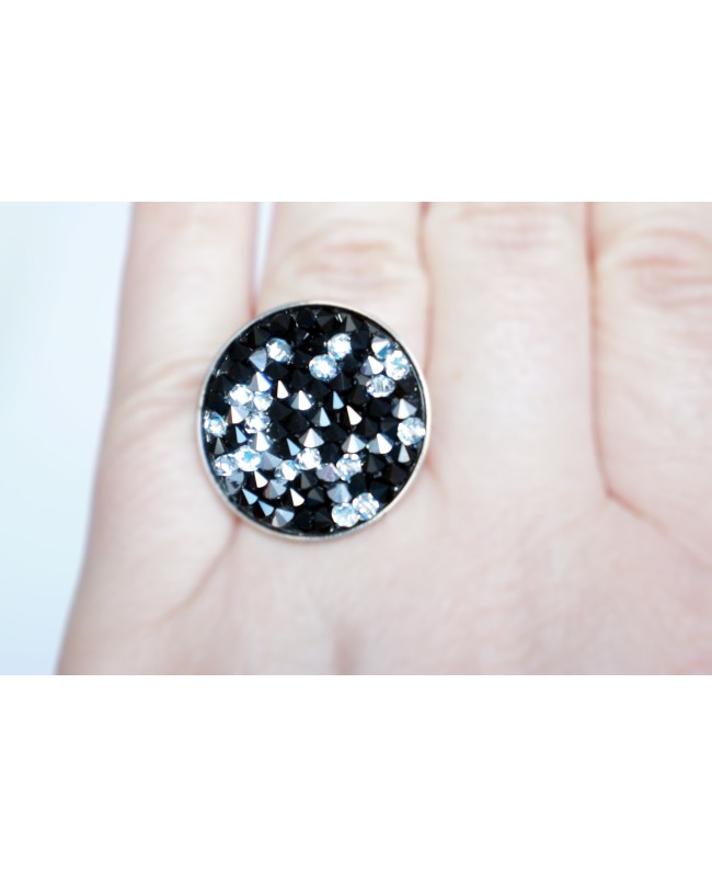 Cette bague fantaisie ajustable a été réalisée à partir d'un support argenté ajustable et de cristaux Autrichiens. Les pierres ont 3 nuances différentes : noire, argentée et cristal (transparent). Les cristaux ont une forme de losange ou de toupie.