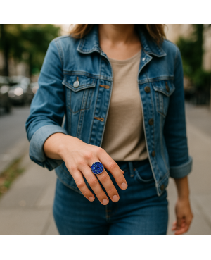 Originalité et classe sont les maîtres mots pour cette bague ajustable réalisée avec des cristaux de Swarovski bleus. D'un diamètre de 25 mm, vous aimerez la sobriété des couleurs et l'éclat des cristaux. Les petites toupies bleues révèlent des reflets bleus métalliques à la lumière.