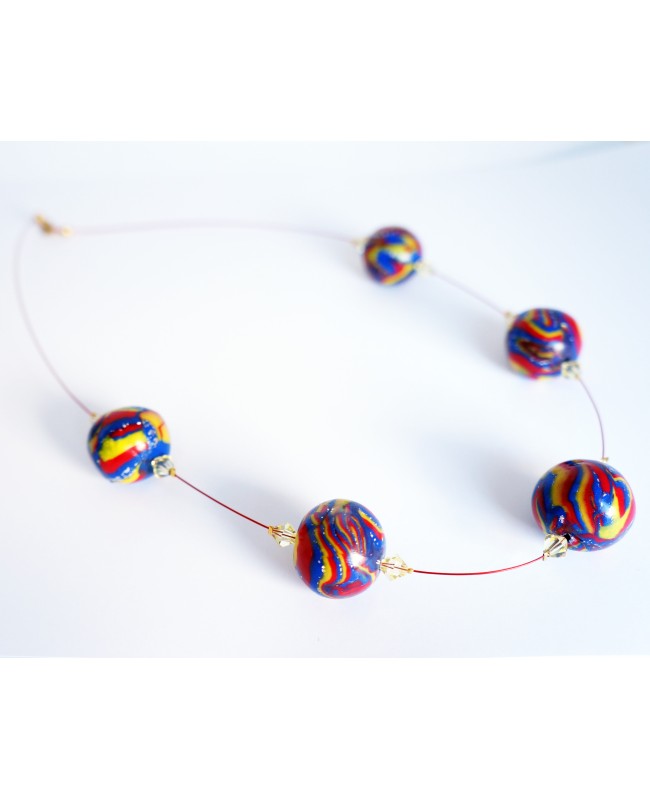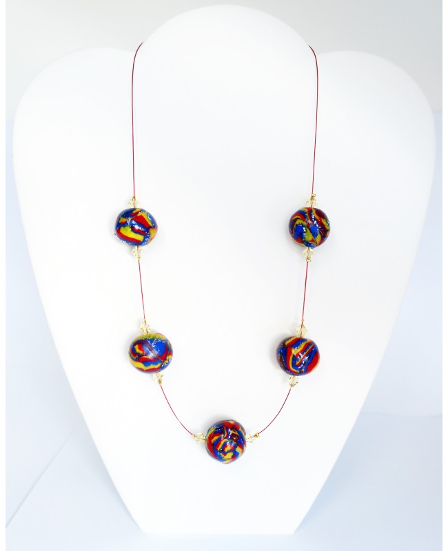 Les perles principales ont été réalisées en pâte polymère rouge, jaune et bleu avec de la feuille d'argent pour apporter de la brillance à la lumière. Elles ont un diamètre d'environ 2 cm. Chaque perle est entourée de petites perles (toupies) jaunes et transparentes en cristal de Swarovski. Le tout est fixé sur un fil câblé rouge.