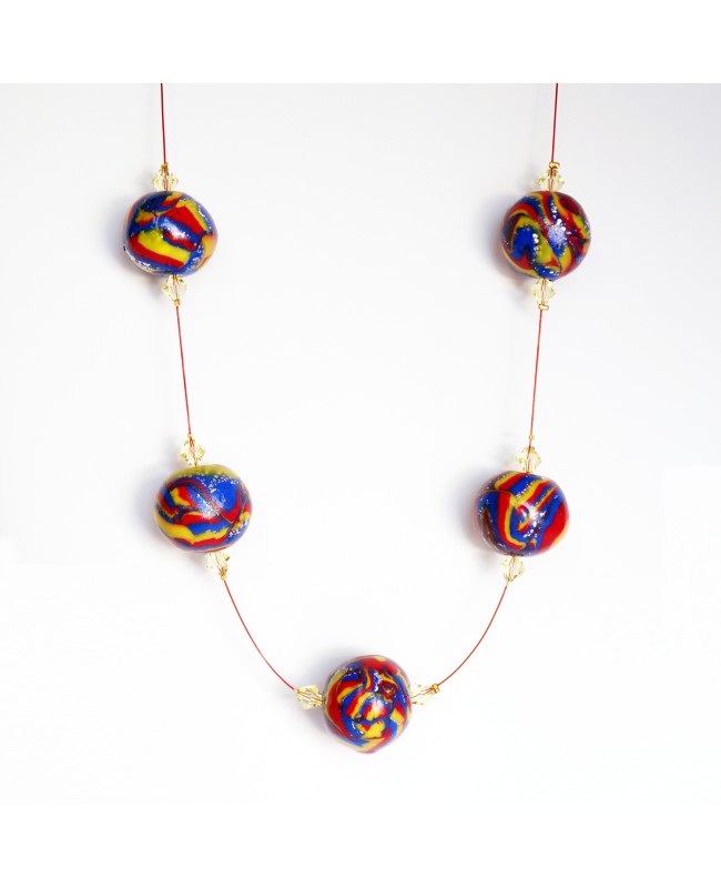 Marre de la grisaille et de la pluie? Envie d'un peu de couleur dans votre vie? Parfois, il suffit de peu de chose et un collier coloré peu illuminer votre journée! Ce collier aux couleurs vives multicolores (rouge, jaune, bleu avec de l'argent) mesure 52 cm et les perles principales ont été fabriquées à la main. Elles sont entourés de petites perles jaunes en cristal de Swarovski.