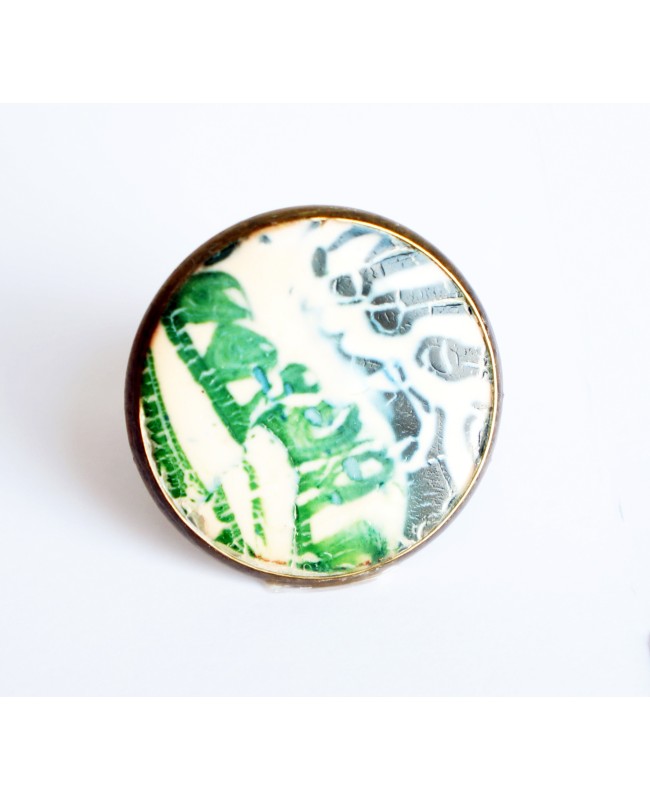 Avec son grand diamètre de 2,8 cm, cette bague ne passe pas inaperçue. Verte et blanche, vous aimerez ses couleurs et l'originalité de son motif. Disponible en un seul exemplaire, vous ne trouverez cette bague nulle part ailleurs puisqu'elle est vendue en exclusivité sur ce site internet. Cependant, pour plus d'originalité, vous pourrez assortir ce bijou avec un pendentif, un collier ou des boucles d'oreilles assortis.