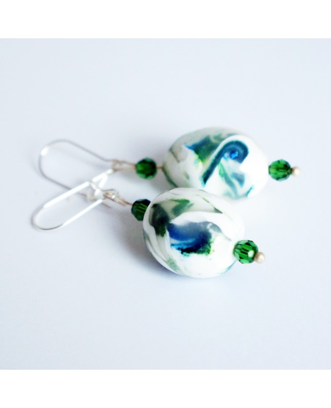 Les perles principales (ovales) de ces boucles d'oreilles ont été réalisées à la main en argile polymère. Une fois cuite, le résultat est ainsi résistant et léger. Vertes et blanches, ces boucles d'oreilles jouent sur la transparence pour une résultat unique, moderne et original. Afin de mettre en valeur les perles artisanales, de petites perles rondes, à facettes et vertes en cristal de Swarovski ont été ajoutées de chaque côté des perles. Elles apportent ainsi de la brillance et font ressortir les couleurs des perles principales.