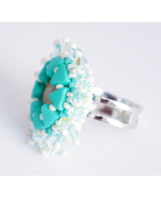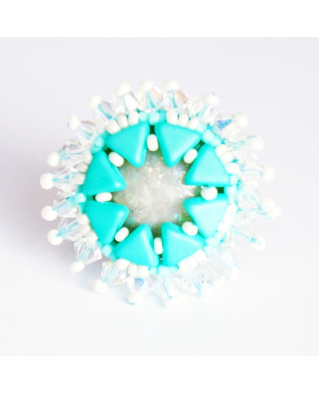 Ses couleurs sobres et brillantes prennent toute leur ampleur lorsque la lumière traverse les toupies en cristal de Swarovski. La bague devient alors scintillante et met en évidence l'alliance de blanc et de turquoise. Le cabochon central scintille également et a été réalisé à la main à partir de pâte polymère. Les perles autour ont été tissées à la main par nos soins.