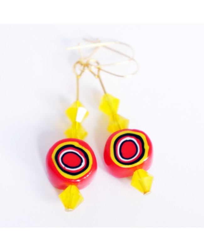 Uniques, rigolotes et colorées, ces boucles d'oreilles ne vous laisseront pas indifférent. Les couleurs lumineuses vous apporteront l'originalité alors que la qualité des matériaux ajoute une note "précieuse". De plus, il s'agit d'un modèle unique unique puisque les perles rondes, qui rappellent une cible, ont été créées dans notre atelier à partir d'argile polymère. Des toupies jaunes en cristal de Swarovski renvoient la lumière pour un résultat encore plus lumineux et précieux.