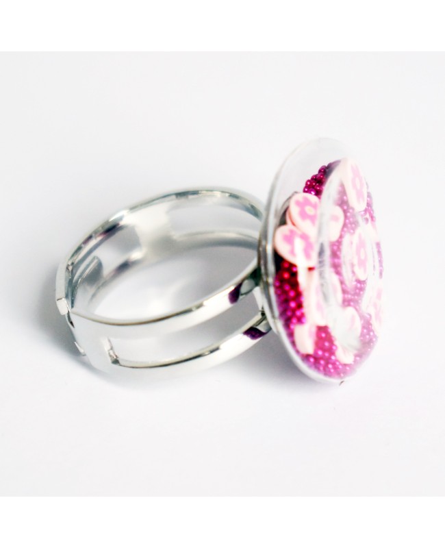 Un peu de fantaisie avec cette bague rose, réalisée à la main, en microbilles et petites tranches de fleurs en pâte polymère. La fiole en verre est plate et a un diamètre de 22 mm. Elle est fixée sur un support ajustable métallique et argenté. L'anneau s'adapte ainsi parfaitement à votre taille. Le "flower power" est de retour!!!