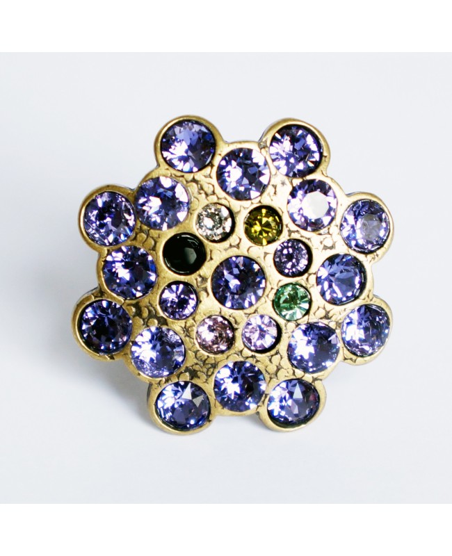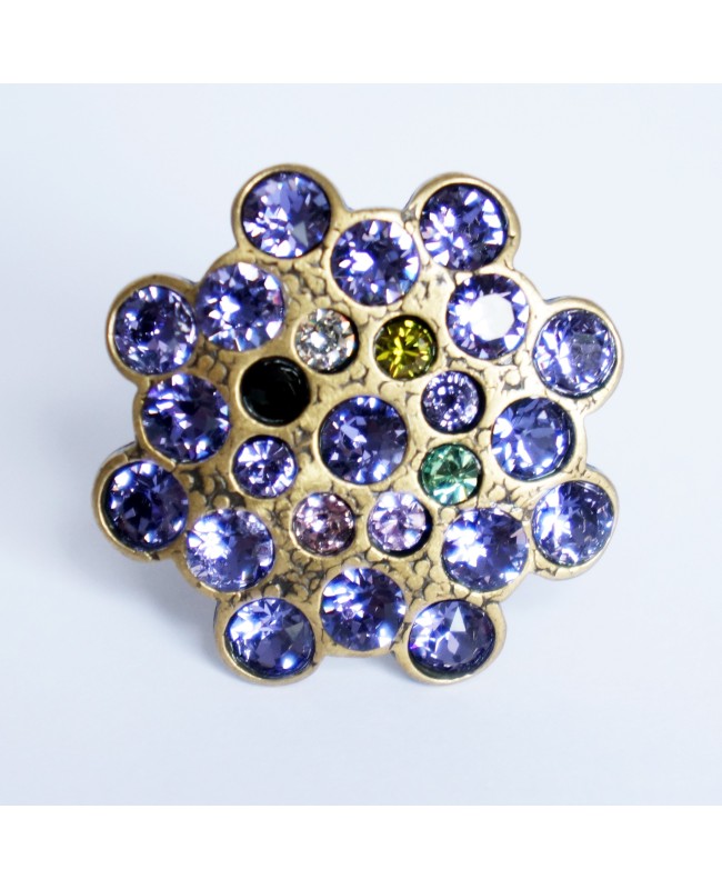 Cette bague, d'un diamètre de 3 cm, reste malgré tout très facile à porter grâce aux couleurs simples et harmonieuses qui la constituent. En effet, nous sommes partis d'un support de couleur bronze pour fixer nous-même, un à un, tous les cabochons en cristal. Les plus grands sont violets tandis que le centre de la bague est constitué de cristaux de toutes les couleurs. Le résultat est ainsi original et révélera toute son audace quand la lumière viendra frapper les cristaux.