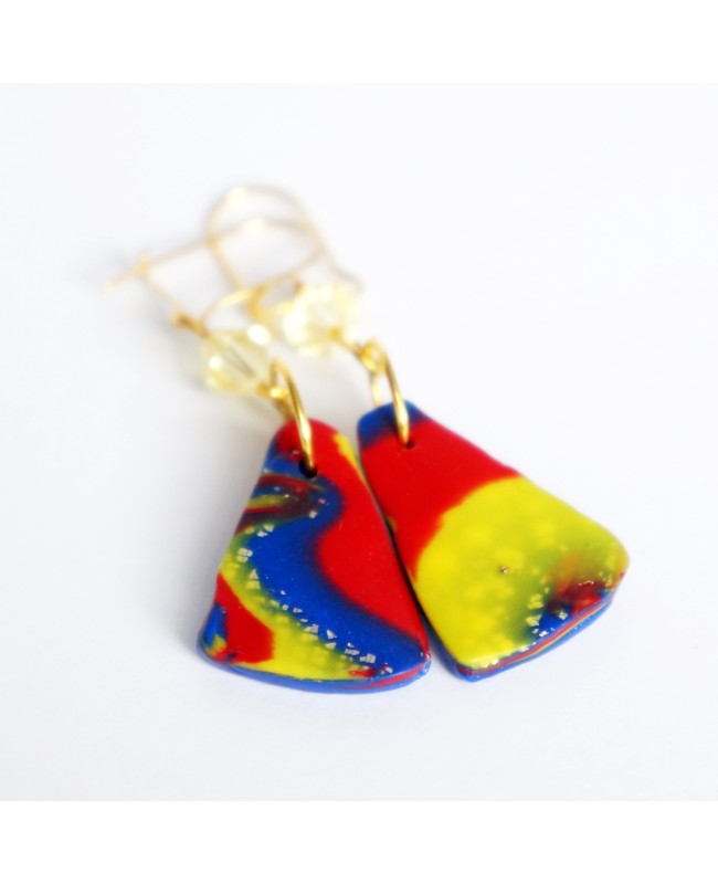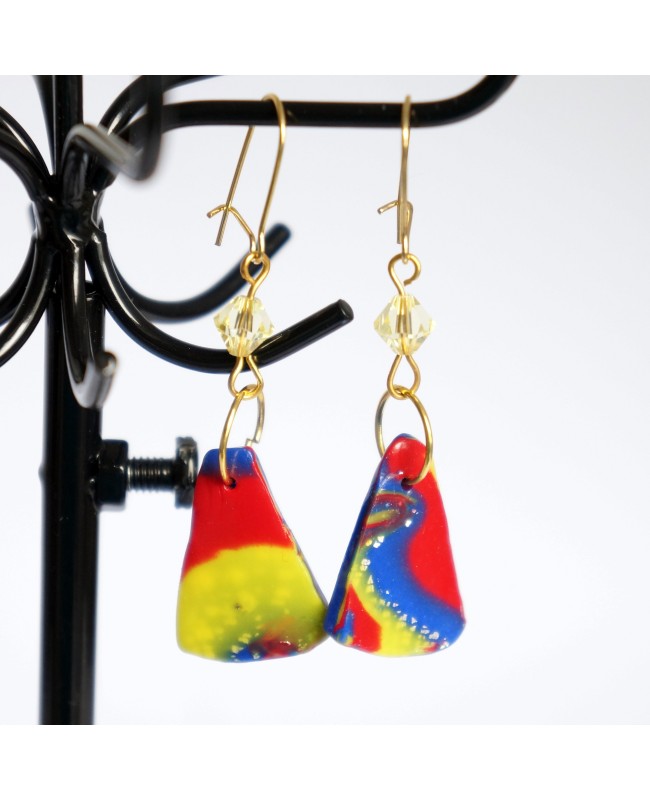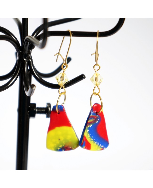 Jaune, bleue et rouge, ces boucles d'oreilles sont colorées, funs et audacieuses! Leur forme triangulaire apporte l'originalité et les reflets argentés renvoient la lumière. La partie triangulaire de ces boucles d'oreilles a été réalisée à la main à partir d'argile polymère. Le résultat est ainsi léger, solide et facile à porter! Pour apporter une finition chic à ce bijou fantaisie, nous avons réhaussé la partie triangulaire d'une petite perle (toupie) en cristal de Swarovski. Le support et les anneaux sont en métal doré.