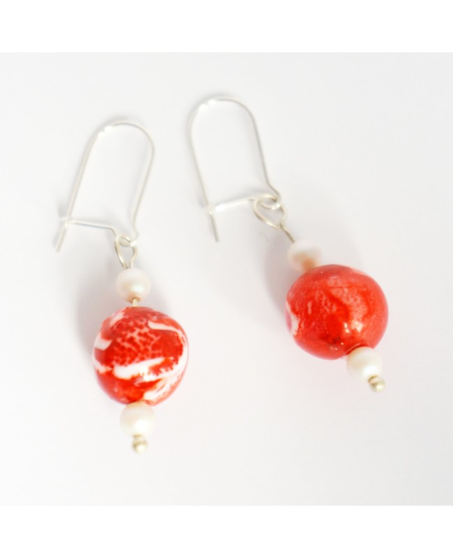 Ces boucles d'oreilles ont été entièrement réalisées à la main, dans notre atelier. Nous avons donc apporté le plus grand soin à leur conception afin de garantir un travail unique et de qualité. Afin d'aller toujours plus loin dans le fait-main, les perles principales oranges ont été fabriquées par nos soins à partir d'argile polymère, de feuille d'argent et d'encre orange. Les perles obtenues sont ainsi uniques et inimitables! Le petit plus? Les reflets métalliques apparaissent à la lumière du soleil pour une création lumineuse et incomparable. Afin de pousser toujours plus loin l'originalité, nous avons ajouté, de chaque côté, de petites perles nacrées. Elles sont de la marque Swarovski pour une création de qualité et au fini haut de gamme. En effet, les perles, sous leur aspect blanc nacré, révèlent leur mystère à la lumière. En effet, des reflets multicolores apportent de la luminosité à la création.
