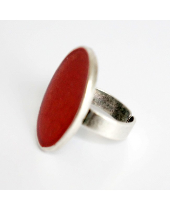 Vous la connaissiez petite et ronde ou carrée, voilà maintenant la grande soeur ovale! Il s'agit de la nouvelle bague rouge en peinture et résine. Comme les autres bagues fantaisie rouges, le peinture est nacrée et forme un effet "écailles". D'une longueur de 3 cm pour une largeur de 2,5 cm, le support de ce bijou est réglable. La partie rouge a été fabriquée par nos soins, dans notre atelier.