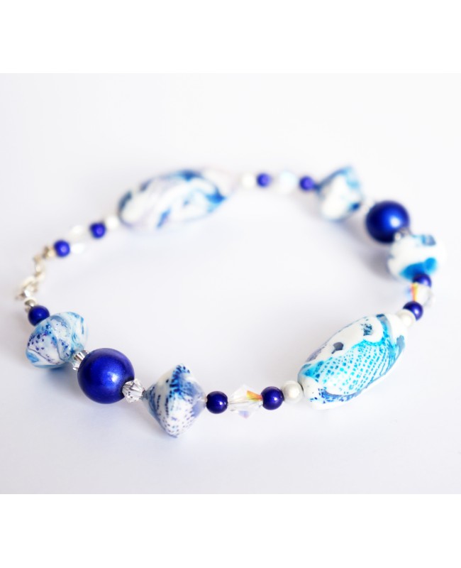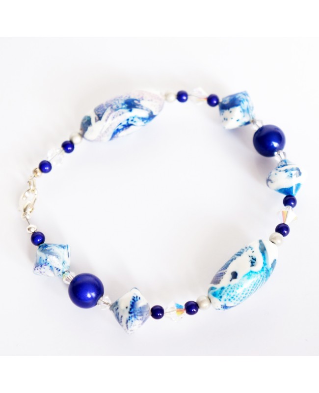 Disponible en un unique exemplaire, ne passez pas à côté de ce bracelet dont certaines perles ont été réalisées à la main. En effet, les perles bleues et blanches ont été réalisées à la main à partir d'argile polymère. Le résultat ainsi obtenu est ainsi unique et original. Les perles sont solides et résistantes. Afin de finaliser cette création, nous avons entouré ces perles par de plus petites perles miracles bleues (les reflets de ces perles à la lumière donnent une profondeur unique) et de toupies transparentes en cristal de Swarovski.