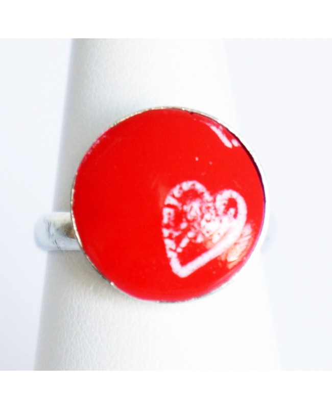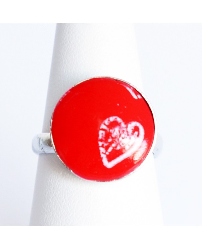 Adepte des bijoux aux couleurs vives et aux motifs rigolos, cette bague rouge avec un petit coeur blanc ne pourra que vous plaire par son originalité. D'un diamètre de 1,6 cm, le cabochon rouge a été réalisé par nos soins en argile polymère. Le support argenté est réglable et vous pourrez donc ajuster la taille vous-même.