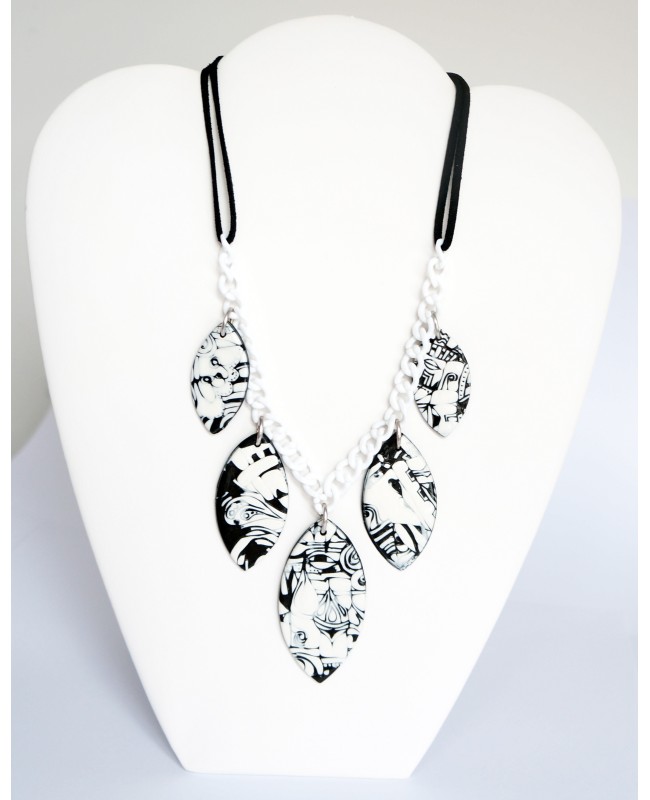 Moderne et original, ce collier noir et blanc a été entièrement réalisé à la main. Les perles longues sont légèrement en relief et fabriquées à partir d'argile polymère. Elles sont fixées sur une chaîne acrylique blanche et le collier est fini par de la suédine noire. Mi-long, ce bijou mesure 44 cm. Léger et solide, ses motifs modernes accompagneront une tenue décontractée ou plus habillée.