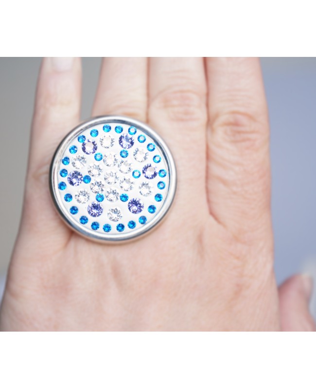 Créée dans notre atelier, cette bague fantaisie plaira à celles qui aiment les bijoux brillants et originaux. Elle a un diamètre de 38 mm et l'anneau est réglable en fonction de la taille de votre doigt. Cette grande bague est donc très facile à porter.