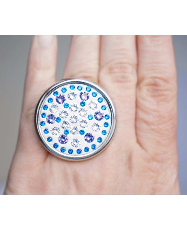 D'un diamètre de 3,8 cm, ce bijou a été conçu sur la base d'une bague réglable argentée.