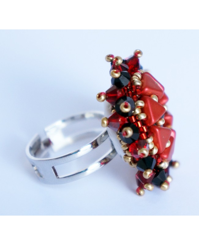 Ses couleurs sobres et brillantes prennent toute leur ampleur lorsque la lumière traverse les toupies en cristal de Swarovski. La bague devient alors scintillante et met en évidence l'alliance de rouge et de noir. Le cabochon central noir est en cristal de Swarovski. Chaque perle a été tissée et fixée à la main.