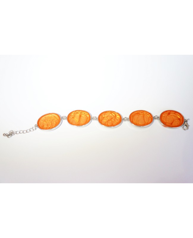 Ce bracelet orange réalisé à la main plaira à celles qui aiment porter des couleurs vives à leur poignet. Réalisé sur une base métalique argentée, la partie orange a été fabriquée dans notre atelier à partir de peinture. Les écailles formées sont aléatoires et ce bracelet est donc une pièce unique. Pour protéger le tout, nous avons ajouté une couche de résine.