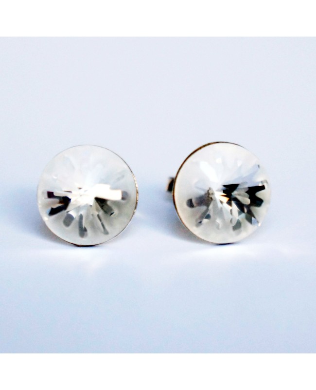 Ces boucles d'oreilles ont un diamètre de 1 cm et se portent directement sur l'oreille. Le cabochon argenté (ou cristal ou blanc) est en cristal de Swarovski et a un effet "givré". En effet, il alterne des parties mats avec des parties brillantes. Le résultat est ainsi original et unique.