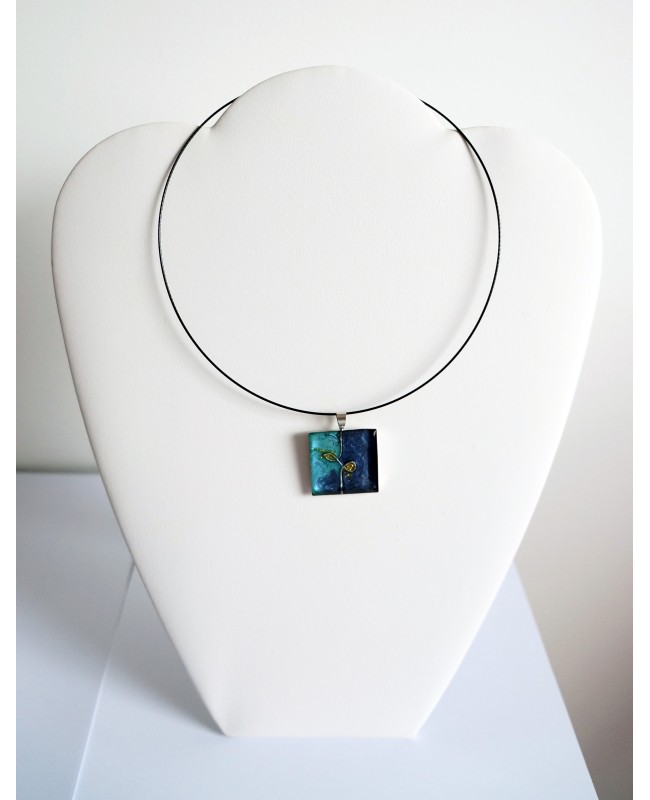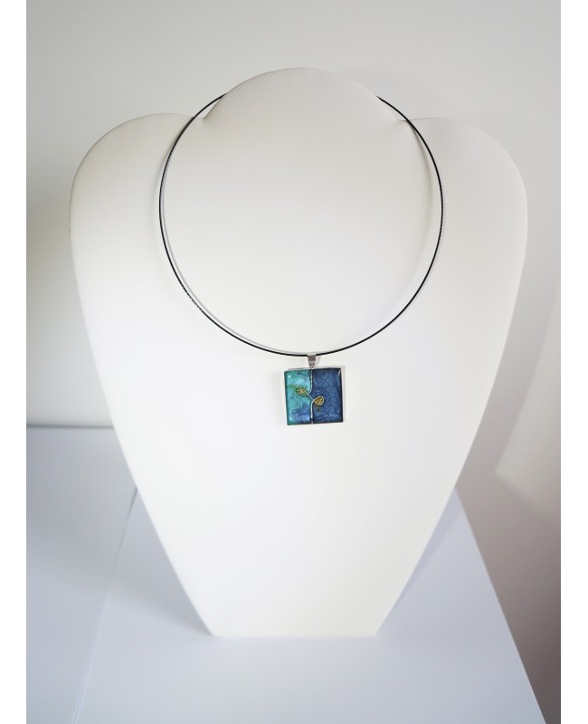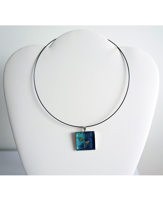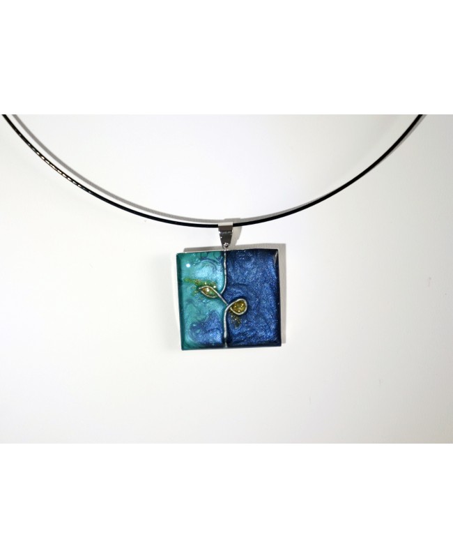 Très beau pendentif carré réalisé à partir de peinture à effets "prismes" fixée sur un support métallique argenté. Les effets bleus et turquoises sont renforcés par une pointe de peinture dorée à paillettes qui apporte de la luminosité à l'ensemble. D'une taille de 2,6 cm, ce bijou est à la fois discret et unique puisqu'il est impossible de reproduire à l'identique les effets de la peinture.