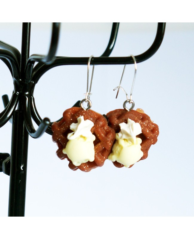 Envie d'affirmer votre personnalité et votre gourmandise? Si oui, ne passez pas à côté de ces boucles d'oreilles gourmandes représentant des gaufres de Liège avec leur pointe de crème chantilly (ou crème fraîche) et sa boule de glace vanille. Réalisées à la main en pâte polymère en Belgique, elles mesurent 2,5 cm de diamètre et la longueur totale est de 3,8 cm.