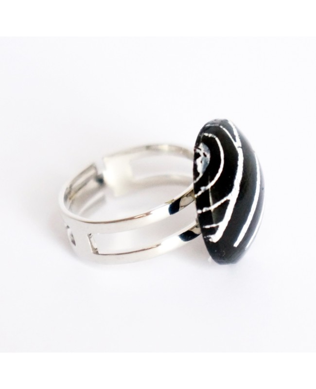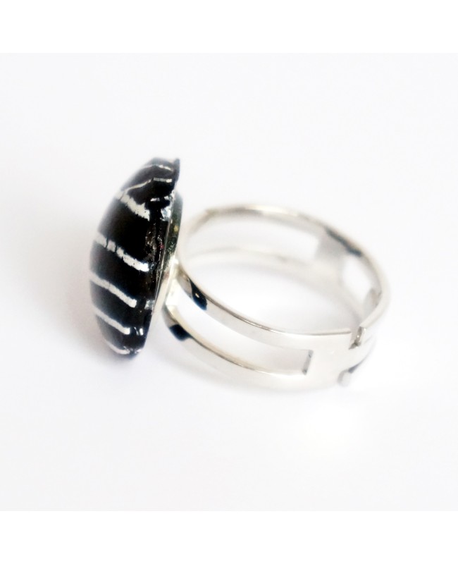 Cette bague noire avec des rayures blanches a un diamètre de 2 cm. La partie supérieure a été fabriquée à la main et a été fixée sur un support argenté dont la taille est réglable. Les rayures blanches sont irrégulières et apportent de l'originalité puisque certaines sont concentriques.
