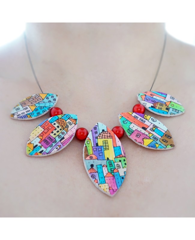 Pour mettre un peu de couleur dans votre vie de tous les jours, découvrez ce très beau collier multicolore fait-main. Les perles longues sont en argile polymère et les motifs en forme de maisons ont été colorés à la main par nos soins. Mi-long, ce bijou d'une longueur de 47 cm est léger et très facile à porter.