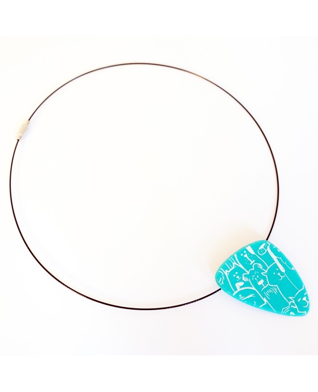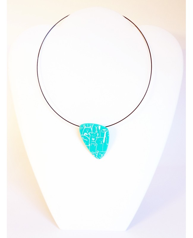 Ce pendentif a une largeur de 3,5 cm pour une hauteur de 5 cm et est entièrement réalisé à la main en argile polymère. Il se porte ras-le-cou avec son tour de cou noir.