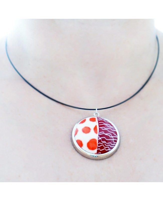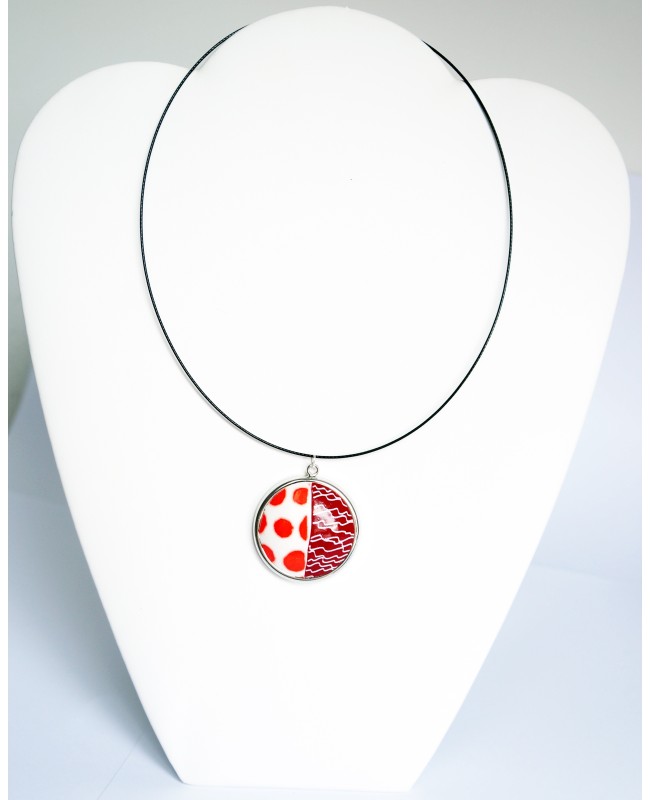 C'est le moment de s'amuser un peu avec ce pendentif rouge et blanc. Il se divise en 2 parties : d'un côté des pois et de l'autre des gribouillis. D'un diamètre de 4 cm, il se porte court avec son tour de cou noir en fil câblé.