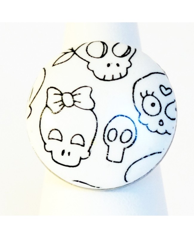 Cette bague réglable mesure 2,5 cm de diamètre. Le cabochon en argile polymère a été entièrement conçu par nos soins. Nous avons ainsi fixé des têtes de mort sur de la pâte polymère blanche.Le résultat noir et blanc a ensuite été verni pour protéger l'ensemble. Le tout a été fixé sur une bague en métal argenté réglable. Ce bijou fantaisie est une création unique en vente en exclusivité sur ce site internet.