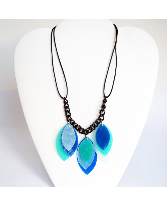 Ce collier est une version modernisée des colliers des Indiens. Adieu les plumes et bonjour les navettes en pâte polymère transparente. Le résultat est surprenant et lumineux. Les navettes, qui ont été réalisées dans notre atelier, sont montées sur une chaîne acrylique noire qui se prolonge par un cordon satiné noir. Enfin, pour vous donner plus de flexibilité, ce collier se termine par un fermoir chaîne qui permet de modifier sa longueur. Vous pourrez donc faire passer ce collier de 42 à 48 cm.