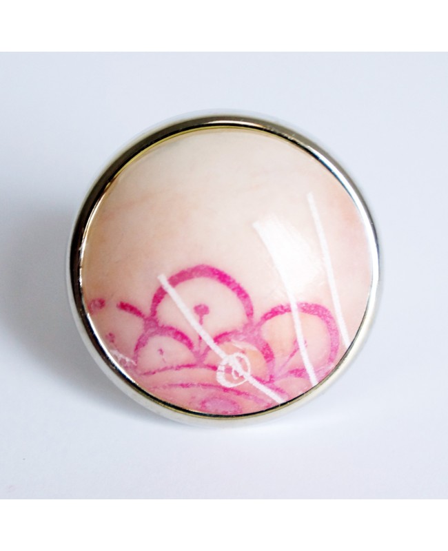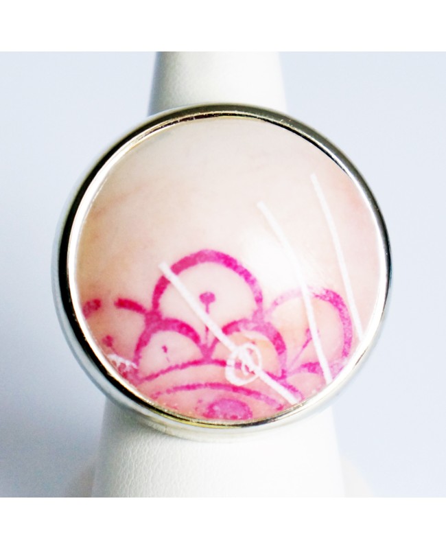 Avec cette bague dont le cabochon est une création 100% fait-main en argile polymère, le printemps s'invitera chez vous toute l'année. Sur une base beige légèrement rosée, une fleur rose apparaît toute en transparence. De légères lignes blanches viennent s'ajouter en superposition pour apporter une touche de fraîcheur à cette bague. Le tout a été fixé sur un support de bague en métal argenté dont la taille de l'anneau peut être modifiée par vos soins. Le diamètre de la partie supérieure mesure 3 cm. Même si cette bague peut paraître grande, elle est très légère et facile à porter. Enfin, argument ultime, cette bague est disponible en un unique exemplaire et il ne sera pas possible de la reproduire à l'identique. Vous porterez donc un bijou de créateur unique.