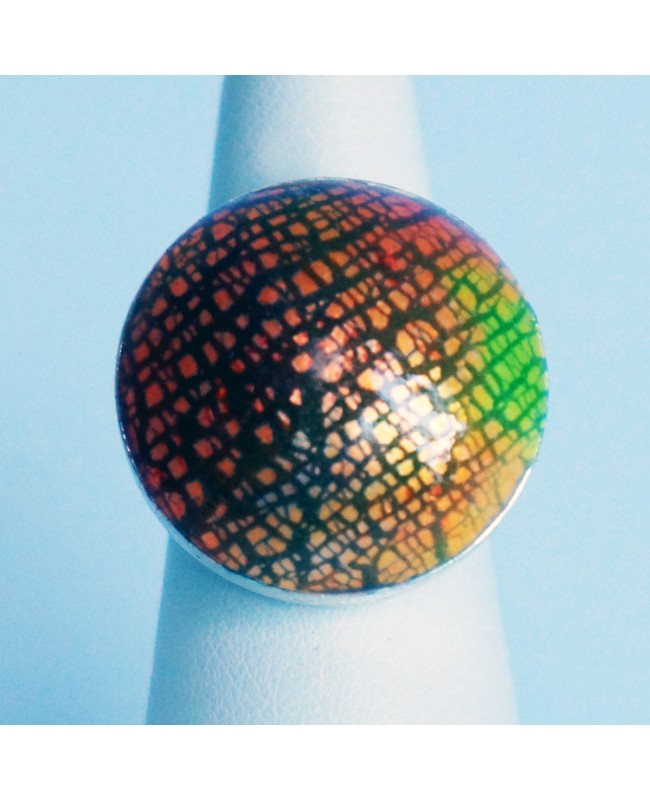 Cette bague réglable est un bijou fantaisie disponible en un unique exemplaire. Le cabochon a été conçu par nos soins à partir d'argile polymère. Sur un fond noir, un effet craquelé avec reflets métalliques met en évidence des couleurs vives telles que le rouge, le orange et le jaune. Le cabochon est légèrement bombé ce qui lui donne un effet tout en courbes et en rondeurs. Une fine couche de vernis a été ajoutée afin de protéger la création et éviter que les couleurs ne partent.