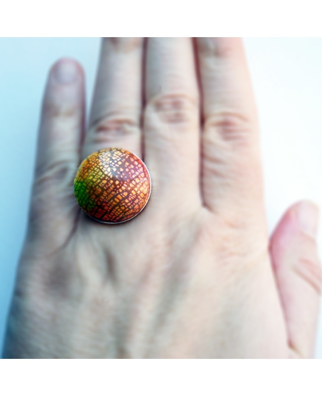 Des couleurs chaudes, des reflets métalliques et un effet craquelé pour cette bague ajustable. Avec un diamètre de 2,5 cm, le cabochon a été conçu par nos soins à partir d'argile polymère. Modèle unique, cette bague s'accordera parfaitement au pendentif ou au collier assorti.