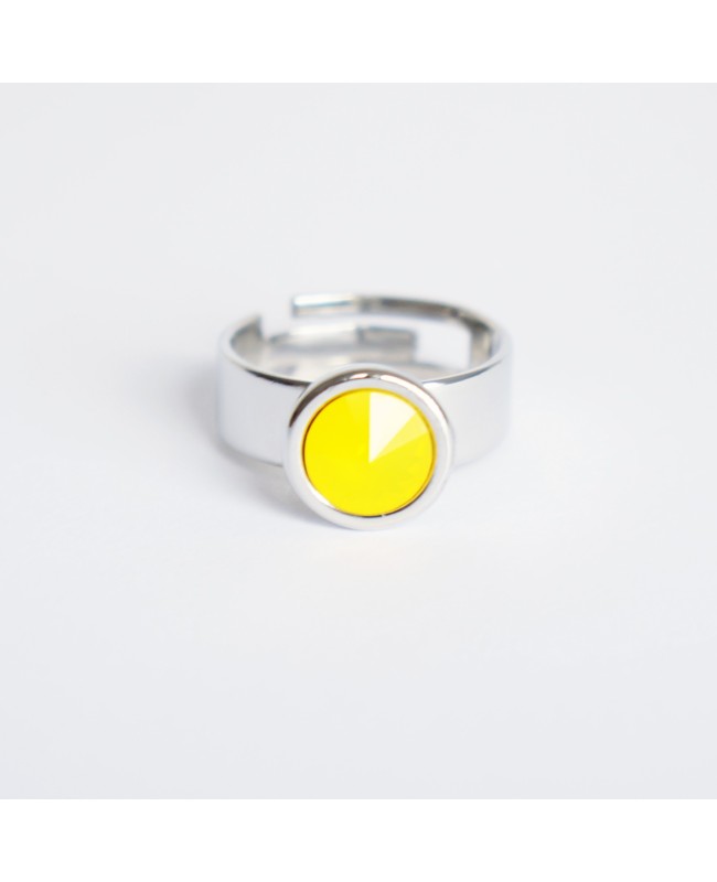 Cette bague en cristal de Swarovski sera du plus bel effet avec sa couleur jaune opal qui apporte énormément de luminosité. Avec 1 cm de diamètre, le cabochon en cristal révèle tous ses reflets à la lumière. L'anneau de la bague est réglable et vous pourrez donc modifier la taille de ce bijou.