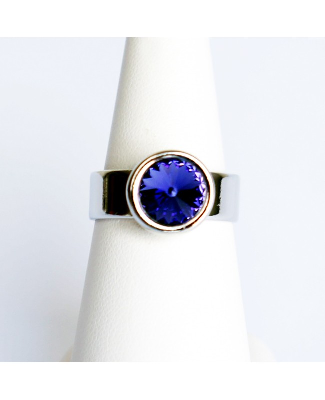 En cristal de Swarovski, cette bague violette ne passera pas inaperçue avec sa couleur très vive et originale. Le cabochon sur la partie supérieure a un diamètre de 1 cm. Il a été fixé par nos soins sur un support de bague ajustable en métal argenté. Le tout est très facile à porter, peut se porter seule ou s'accorder avec d'autres bijoux, et révèle une couleur incomparable à la lumière.