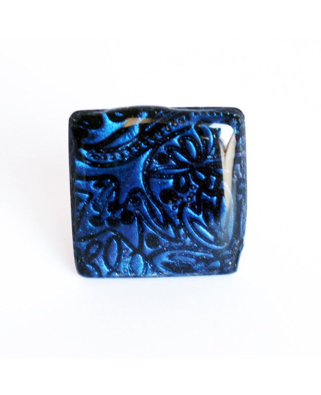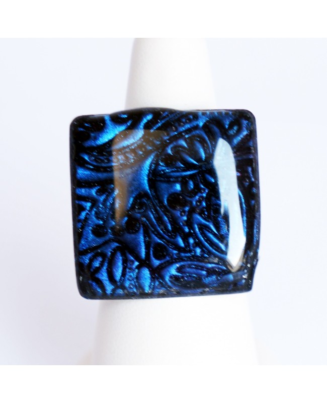 Si vous aimez les bijoux originaux avec des couleurs qui changent en fonction de la lumière, cette bague est faite pour vous. Tout d'abord, nouos vous avons facilité la vie et il n'y aura pas de problème de taille avec cette bague puisque vous pourrez modifier la taille de son anneau. Pour le cabochon, sur une base en argile polymère noire, nous avons ajouté un motif en relief qui se caractérise par des motifs abstraits. Nous avons par la suite ajouté une poudre métallique bleue dont la couleur change sensiblement à la lumière. Enfin, une fine couche de résine protège l'ensemble, apporte de la brillance, intensifie le relief tout en lissant la surface de la bague. Elle protège également la bague des griffures et des accrocs.
