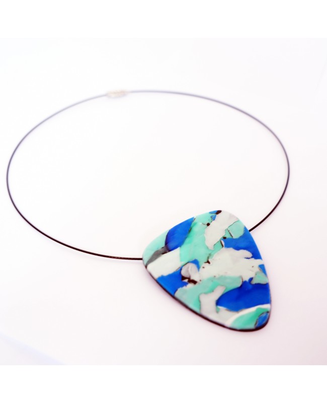 Ce pendentif ras le cou vous rappelera les mers du Sud avec ses couleurs bleu, blanc et vert. Entièrement réalisé à la main, il a une hauteur de 6 cm pour une largeur de 5 cm. Cerise sur le gâteau, vous pourrez l'assortir à une paire de boucles d'oreilles, une bague ou bien découvrir sa version collier.
