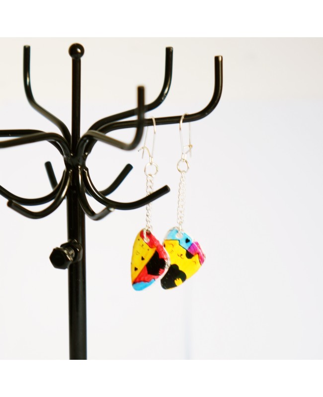 Des petits chats qui tiennent dans leurs pattes des petits coeurs, ça vous dit? Et bien c'est chose faite avec ces boucles d'oreilles entièrement réalisées par nos soins. Un pur bonheur de 5,7 cm de longueur totale et un bijou très léger à porter. La base en argile polymère a été conçue par nos soins et entièrement coloré à la main. Elle se prolonge par une chaîne argentée pour avoir encore plus de mouvements. Le tout est très coloré, très marrant et disponible en un unique exemplaire.