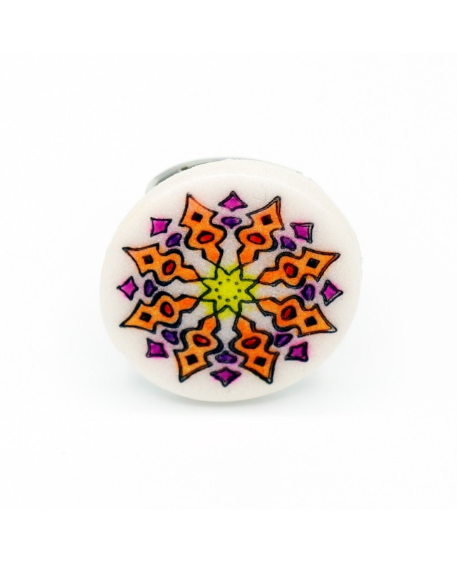 Le mandala se décline désormais dans nos bijoux avec cette bague fabriquée par nos soins. Sur une base en argile polymère blanche légèrement pailletée, nous avons ajouté un motif de mandala que nous avons pas la suite coloré avec des encres à l'alcool. Ce cabochon a ensuite été fixé sur un support de bague ajustable afin que vous puissiez adapter la taille de cette bague à votre doigt. Le résultat est simple, léger mais efficace avec ces couleurs vives qui vous apporteront calme, sérénité mais surtout ... bonne humeur!