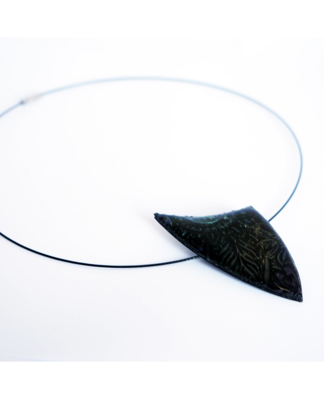Un petit air d'originalité et de modernité souffle sur ce pendentif tout en relief et nuances. De forme triangulaire mais avec des courbes, ce pendentif noir se pare de relief et de reflets multicolores à la lumière. Cet effet de profondeur et métal est accentué et protégé par une couche de résine. Il se porte ras-le-cou et peut-être assorti d'une bague.