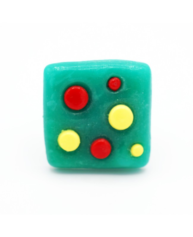 Si vous êtes à la recherche d'un bijou fantaisie aux couleurs vives et acidulées, vous allez adorer cette bague réalisée par nos soins. La partie supérieure est en argile polymère et nous l'avons réalisé dans notre atelier. Elle mesure 2,5 cm de côté et associe le vert à des pois jaunes et rouges. Ce cabochon a été fixé sur un support de bague en métal argenté. Son avantage? Sa taille est réglable et vous pourrez modifier sa taille en fonction de votre doigt.
