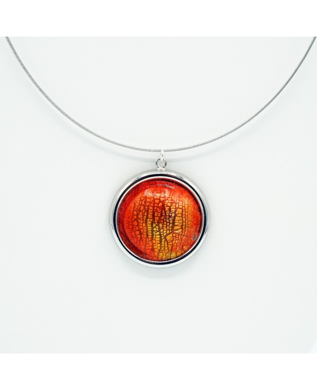 Le orange, le jaune et l'effet métallique à la lumière font leur retour avec ce pendentif de 38 mm de diamètre. Il se porte ras-le-cou et le cabochon central est en argile polymère et réalisé par nos soins.