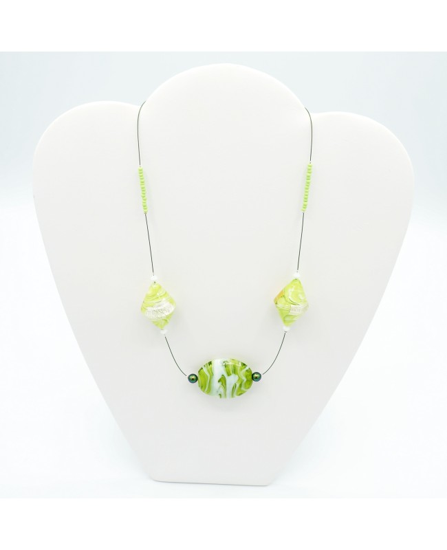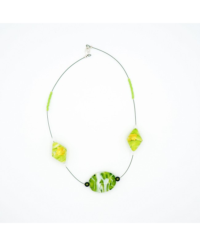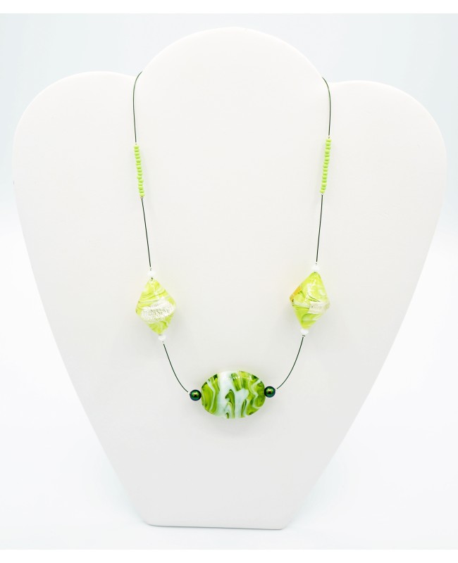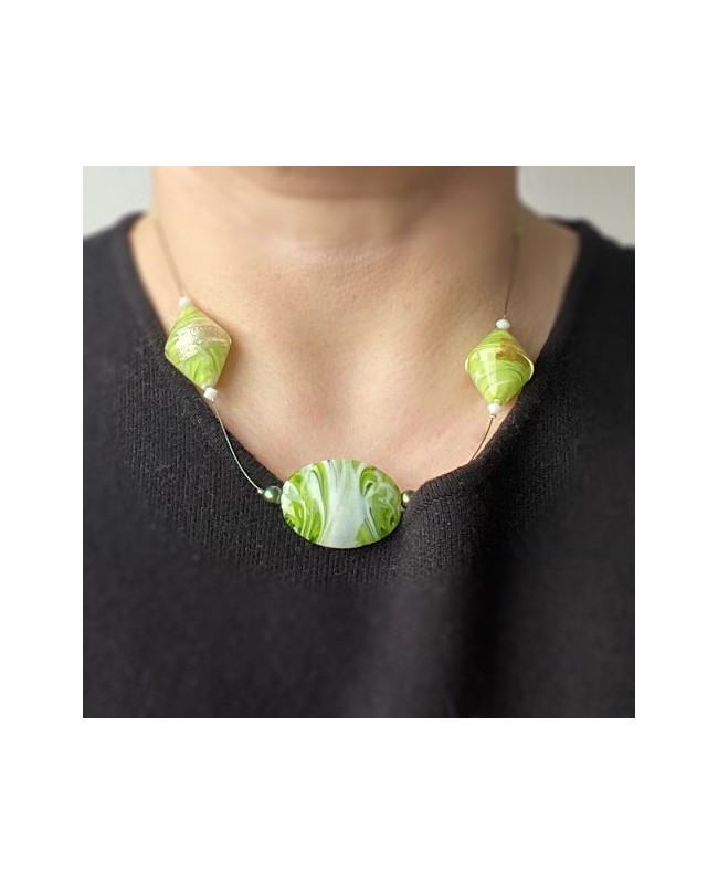D'une longueur de 47 cm, ce collier vert attirera l'attention des autres par l'utilisation de grosses perles en verre qui sont associées à des perles de cristal. La perle centrale est en verre et est un mélange subtil de vert et de blanc. Cette perle est entourée de 2 petites perles nacrées irisées et vertes. Elles renforcent ainsi le volume et le vert de la perle en verre tout en restant discrète. De chaque côté de la perle centrale, 2 perles en forme de toupies viennent compléter l'ensemble. Ces 2 perles sont en verre et sont un mélange subtil de blanc et de vert avec une feuille d'or. Chaque perle est entourée de 2 perles toupies blanches en cristal. Enfin, pour apporter une petite pointe d'originalité et de simplicité à ce collier, de fines perles de rocailles vertes viennent terminer ce bijou en prenant place de part et d'autre. Toutes ces perles sont fixées sur un fil câblé noir qui se termine par un fermoir en métal argenté.