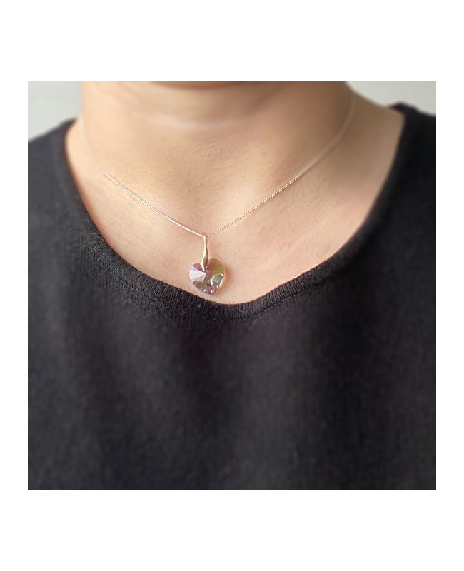 Si vous êtes à la recherche d'un bijou discret et original, ce pendentif en forme de coeur vous plaira. En cristal de Swarovski, il est vert transparent et prend des reflets rose à la lumière et quand on le regarde sue le côté. Il est fixé avec une bélière et est accompagné d'une chaîne ras-le-cou en argent. Le coeur a une largeur de 1,5 cm.