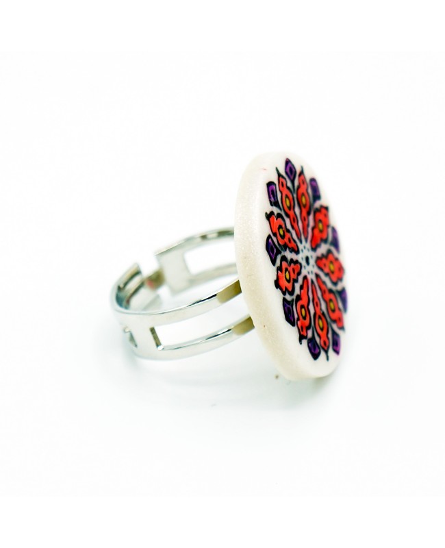 On continue les voyages en Asie avec à cette bague réglable mandala. Avec un diamètre de 2,7 cm, le cabochon en argile polymère blanche se décline avec des couleurs vives et originales sous la forme d'un motif de mandala. Pour cette bague, les couleurs dominantes sont le rouge et le violet avec une pointe de jaune. Légère à porter, elle est disponible en un unique exemplaire.