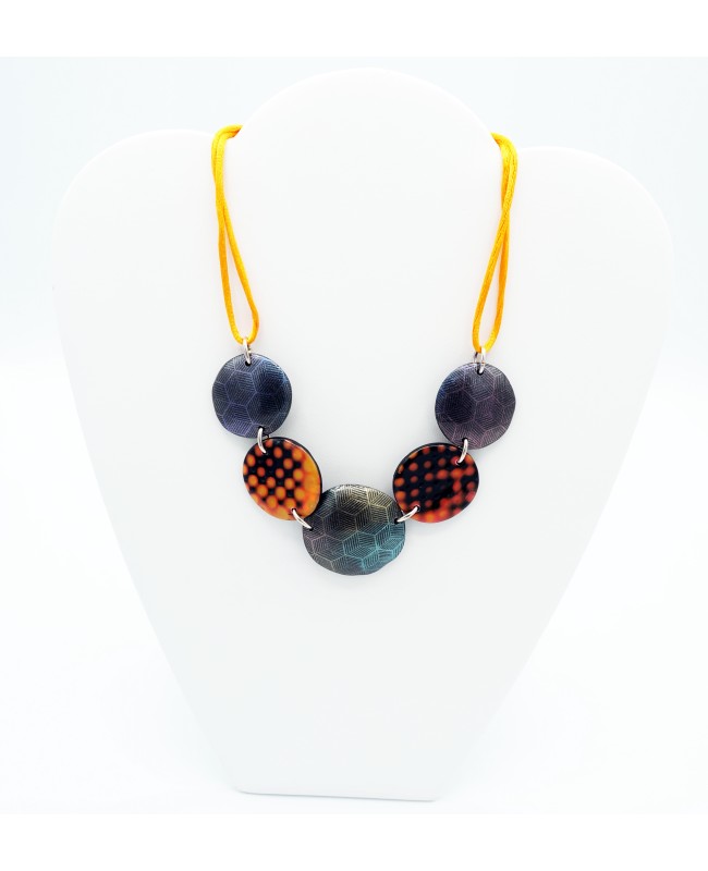 Ce collier court se porte ras-le-cou et est disponible en un unique exemplaire. Les lentilles sont en argiles polymères et conçues dans notre atelier. Les lentilles noires ont un léger motif avec des couleurs métalliques. Les perles oranges sont entièrement en argile polymère et ont un léger relief. Les perles sont reliées entre elles par des anneaux en métal argenté. Un cordon satiné orange termine l'ensemble. Le fermoir est constitué d'une petite chaîne en argent qui permet de jouer sur la longueur du collier. Sa longueur pourra ainsi varier entre 40 et 45 cm de longueur.