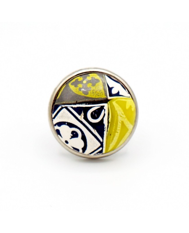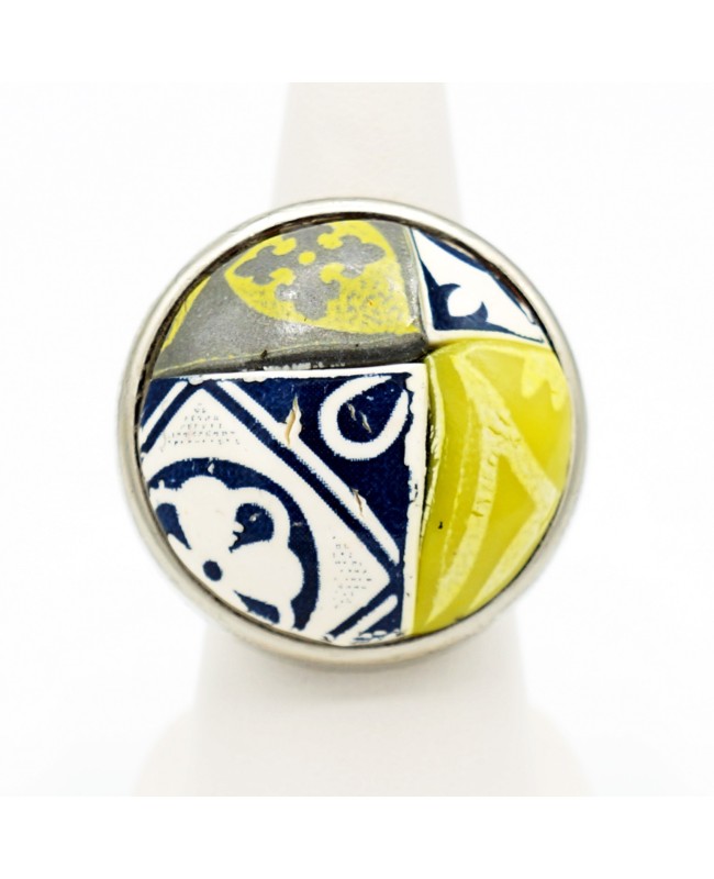 Un petit air de ressemblance avec de la faïence pour cette grande bague jaune, bleue, grise et blanche. Le cabochon a été conçu par nos soins et a un diamètre de 3 cm. Pas de problèmes de taille puisque le support en métal argenté est ajustable. Vous pourrez donc modifier sa taille.