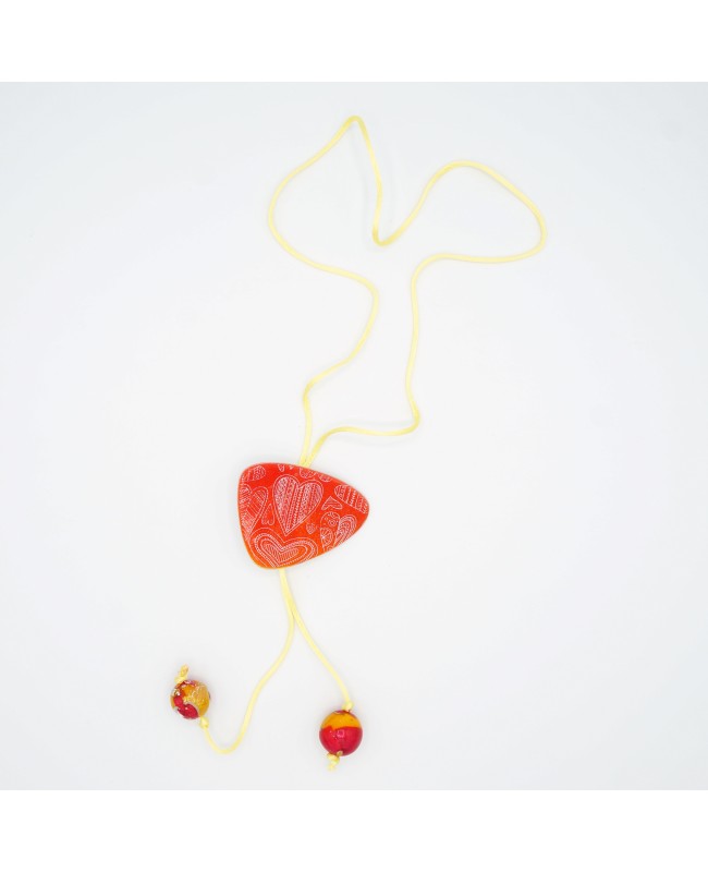 De la couleur, de l'audace et de l'originalité pour ce collier très long entièrement réalisé à la main dans notre atelier. La pièce centrale et les perles sont en argile polymère.
