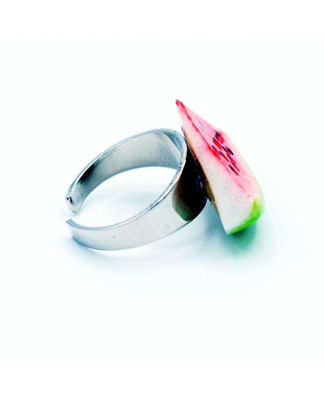 L'été se prolonge avec cette bague pastèque qui a été fabriquée et modelée par nos soins. Cette tranche de pastèque vous apportera toute l'originalité et la fraîcheur d'un bijou fantaisie conçu en un unique exemplaire. La pastèque mesure 2 cm de largeur pour 1,7 cm de hauteur. Le support est ajustable.
